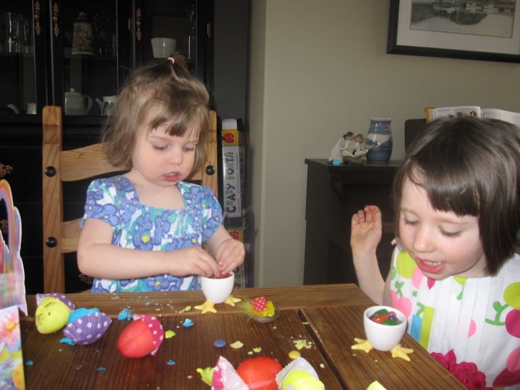 Easter eggs for our family hunt on Sunday morning deserve a post of their own, they were a huge hit with the girls - who wouldn't enjoy smashing real eggs on the floor / table / etc. to find a surprise inside? Then it was just a matter of sweeping up the eggshell before the dogs tried to eat it.